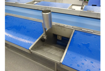 Bei der Ausführung Typ PT-3 mit 3 oder 4 Bändern, wird das Produkt über das auf dem mittleren Niveau gelegene, grosszügig bemessene Zufuhrband zugeführt. Der Mitarbeiter nimmt das Produkt vom Band und bearbeitet es auf seiner Arbeitsplatte. Das bearbeitete Produkt wird auf das höher liegende Produkt-Abfuhrband gelegt. Der Abfall wird entweder über einen Trichter ( Drei-Bandsystem) oder direkt (Vierband-Ausführung) über das auf dem niedrigsten Niveau liegende Abfallband geführt. Dieses transportiert den Abfall zu einem Sammelband. Sämmtliche Bänder sind von FMT-Schnellspannvorrichtungen versehen, so dass eine schnelle und gründliche Reinigung einfach möglich ist. Die Kasten-Ablage, die Arbeitsplatte und der Abfalltrichter sind individuell austauschbar. So kann für jeden Mitarbeiter, sowohl links- als auch rechtshändig, der Arbeitsplatz optimal gestaltet werden.
